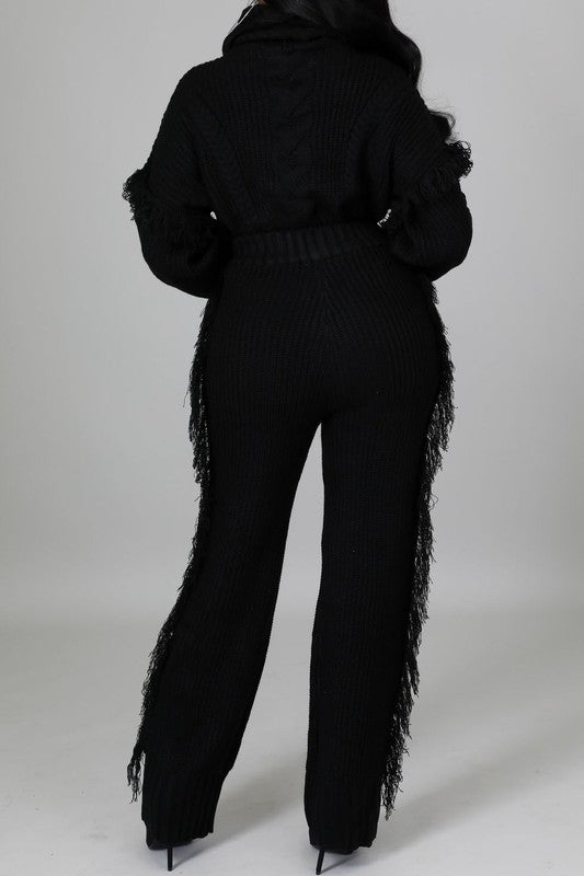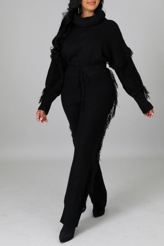 Turtle Neck Cable Knit Sweater And Tasseled Pants Set - Black