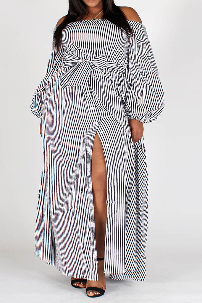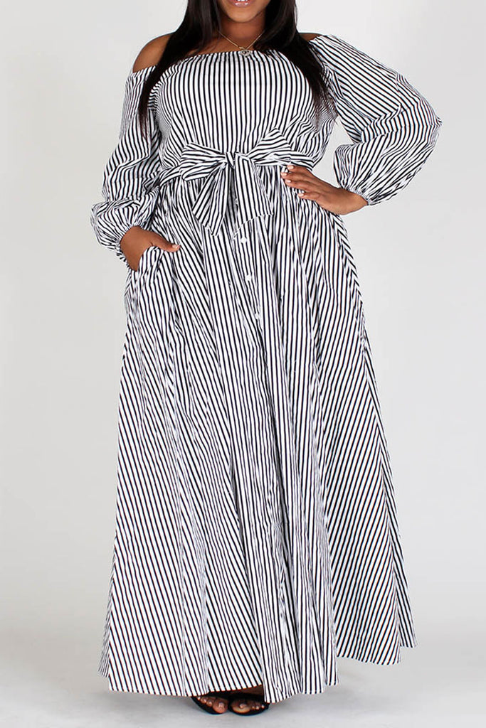 Stripe off shoulder maxi dress in a fit and flare style, with long puff sleeves, waist tie and pleats. Dress is 100% cotton. Available in sizes S-3XL.