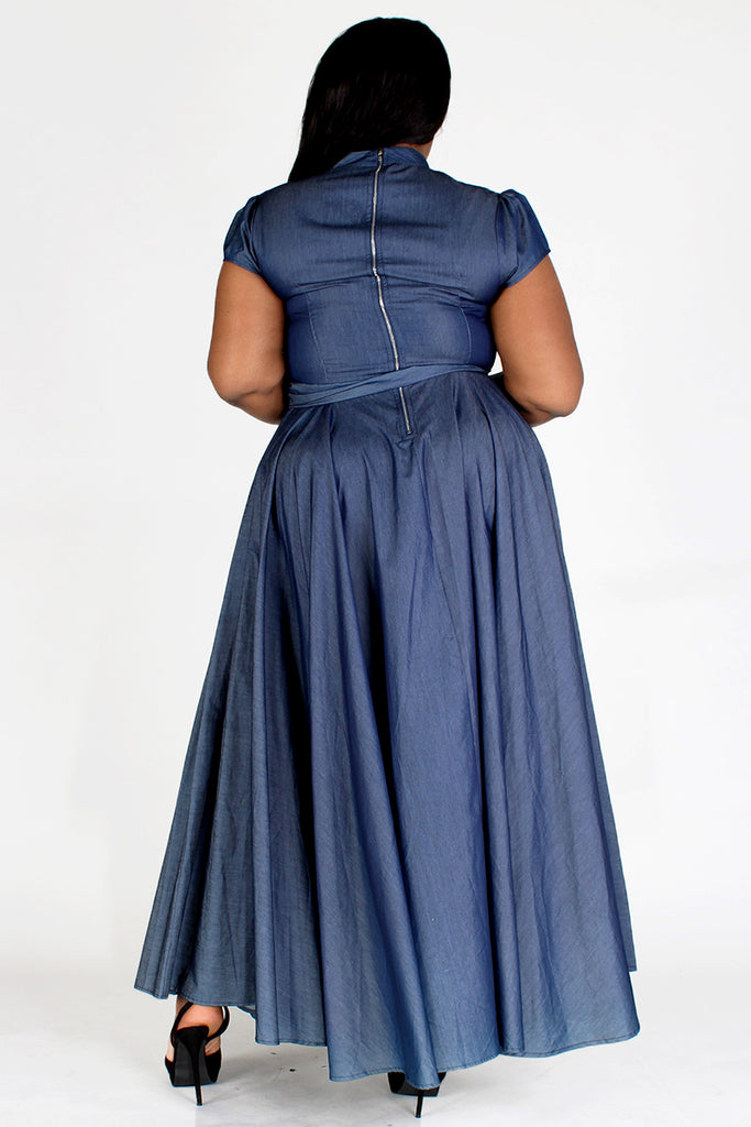 Denim"a-line" Maxi Dress with Waist Pockets (1X-3X)
