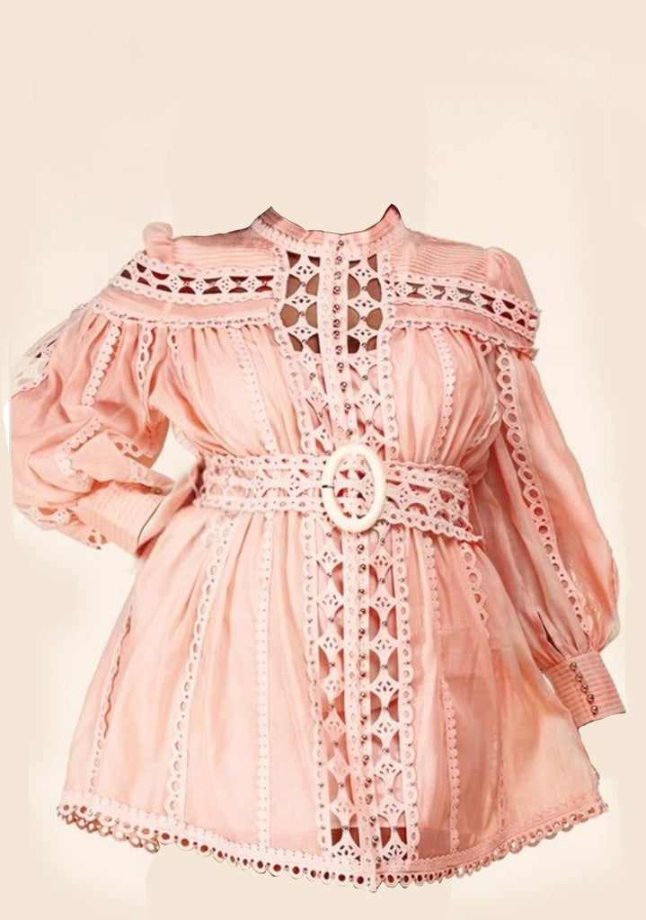This dress also called "Flirty and Fun" is a blush dress that features diamond shape cutouts with silver-tone beads. The dress also features a mock neck, 3-button bishop sleeves, and a fitted waistband with scalloped crochet trim detail.
