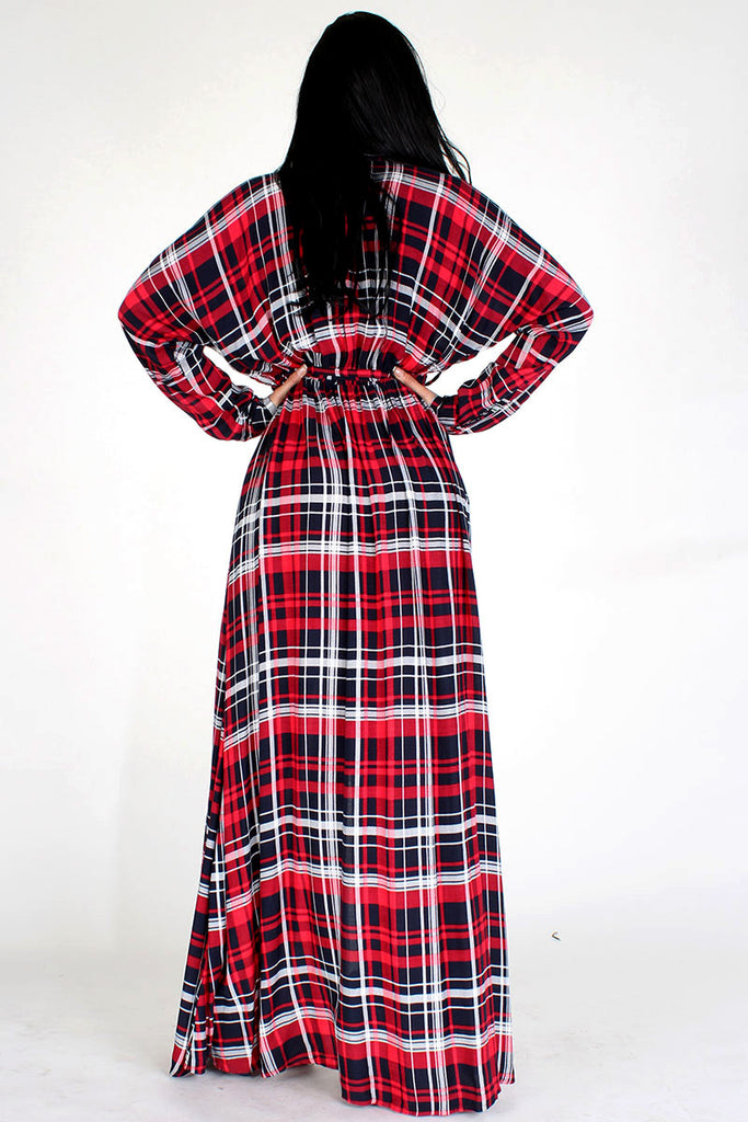 Plaid, a-line, maxi dress in a loose fit with a rolled collar, front button up closures, rolled long sleeves, waist tie belt, and high front slit.