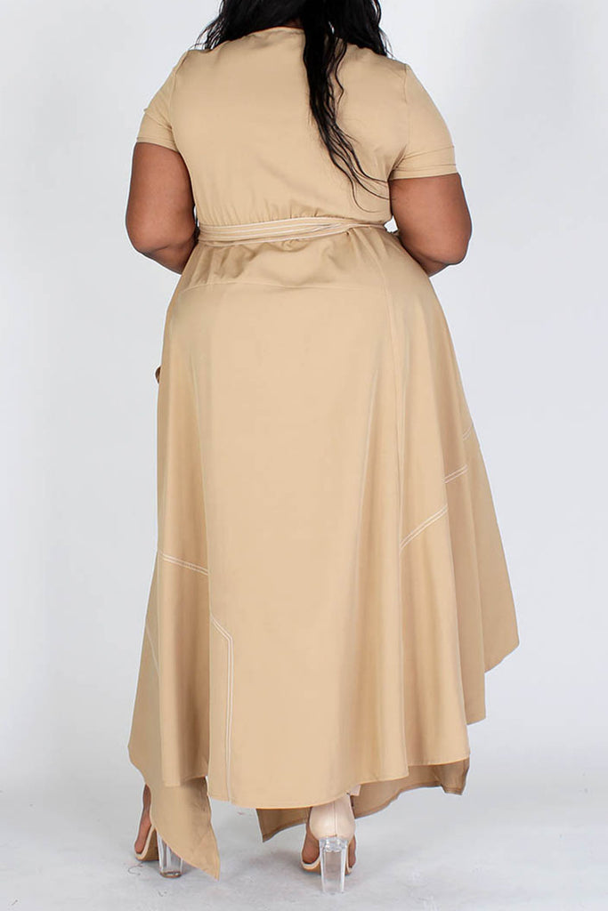 Tan Round Neck Asymmetrical Hem Dress with Belt (Plus Size)