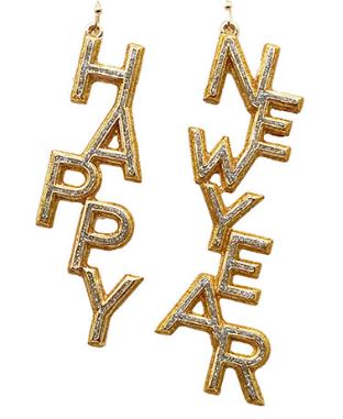 Drop and dangle, fishhook, Happy New Year Earrings. Earrings are 3 inches in length and come in Gold or Multi-Color.